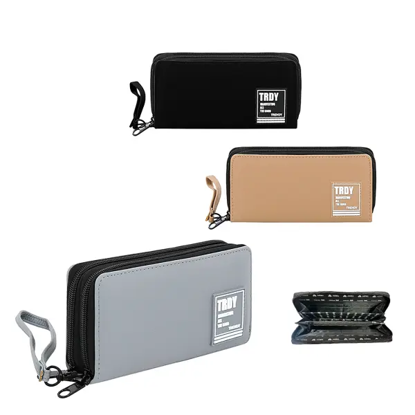 Billetera Trendy 18651 Color: Negro, Kaky y Jean. Medidas: 9,5 cm Alto x 14 cm Ancho x 2,5 cm Profundidad. Material: 100% PU. Contiene: Un bolsillo principal, cuatro compartimientos para tarjetas, cuatro para billetes y/o moneda.