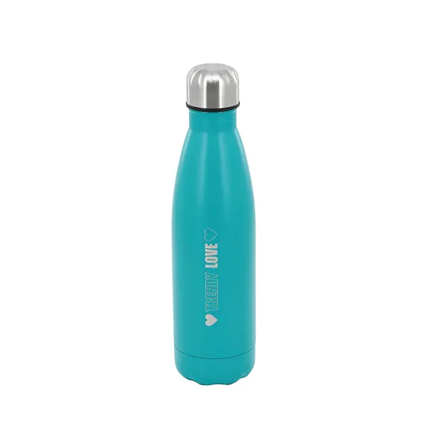 -Material: Botella doble capa 100% acero inoxidable, Tapa doble capa con capa externa de acero inoxidable y capa interna de polipropileno. Tapa a rosca hermetizante de polipropileno con burlete de silicona.