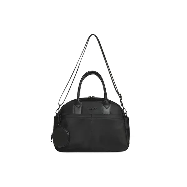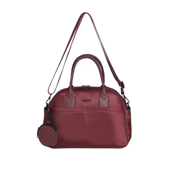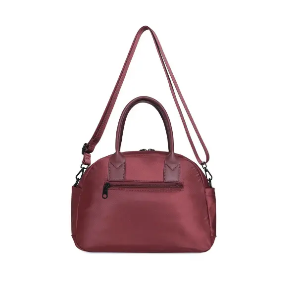 ‘-Color: Bordo, Chocolate y Negro. -Material: 100% Poliéster. -Medidas: Alto 23 cm x Ancho 32 cm x Profundidad 12 cm. -Contiene: Bolsillo principal con bolsillo interno con cierre y bolsillo interno organizador, bolsillos frontales, bolsillo posterior antirrobo, bolsillos laterales, asas de transporte superior, tira regulable desmontable reforzada. -Interior forrado con el logo de la marca. -Incluye Monedero desmontable (8×8 cm).