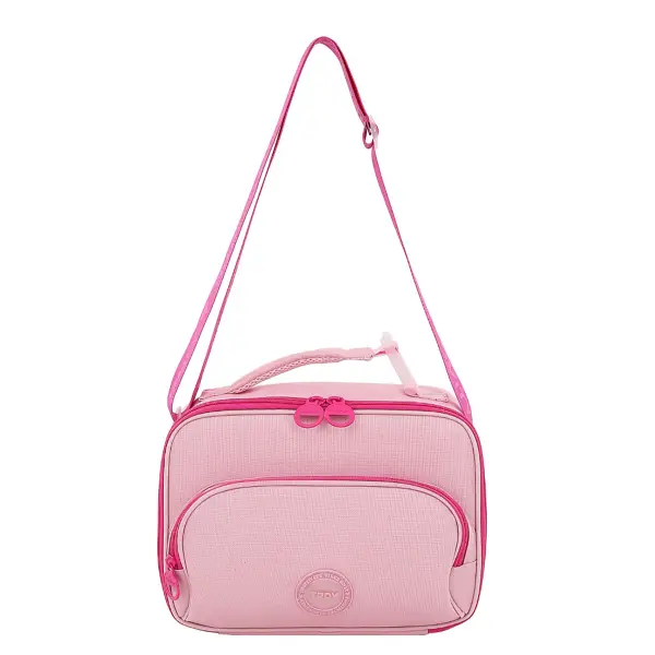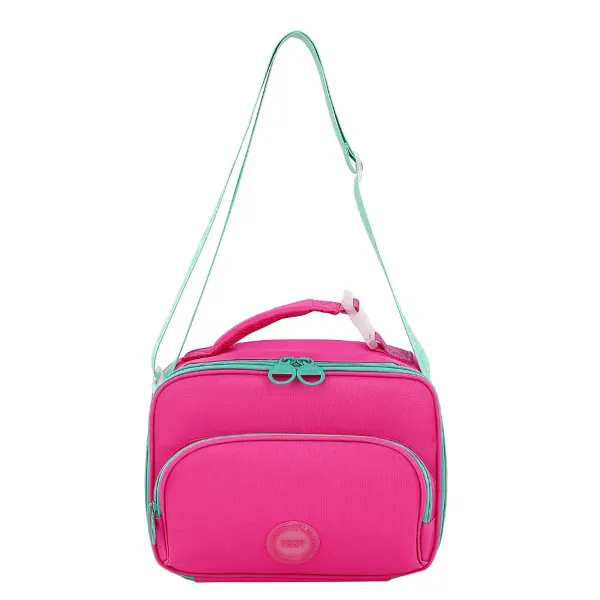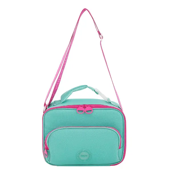 -Contiene: Bolsillo principal con aislante interior, bolsillo frontal, asa de transporte con hebilla, tira regulable.