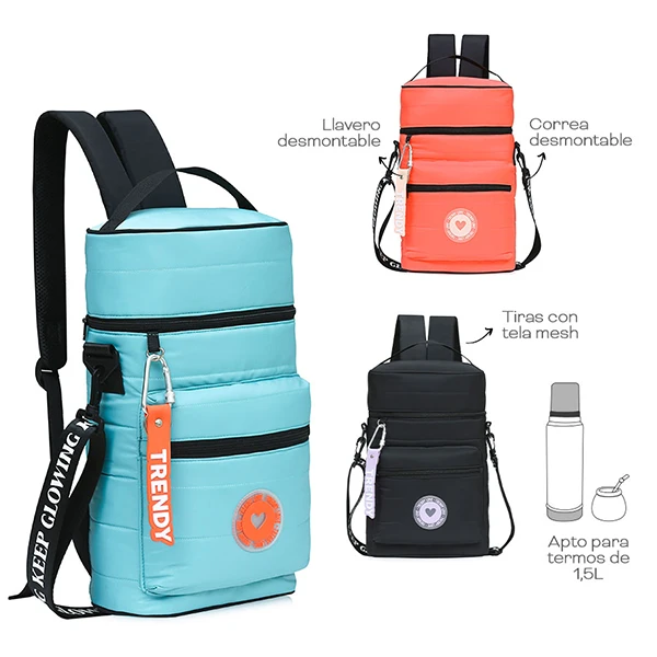 Matera Trendy 17310 Color: Negro, Aqua y Violeta. Medidas: 37cm de alto x 23cm de ancho x 11cm profundidad. Material:100% Poliester.