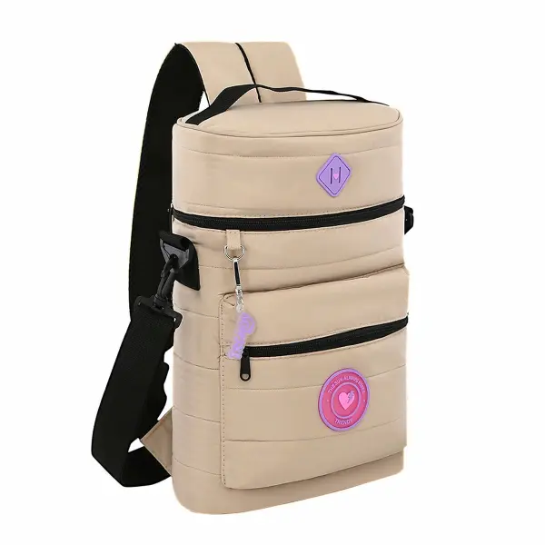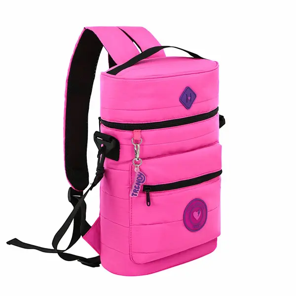 -Contiene: Un bolsillo frontal, un bolsillo principal, tira extraíble y un asa superior de transporte.
