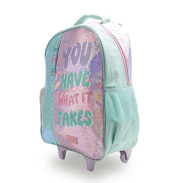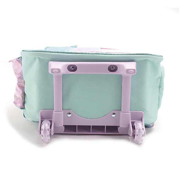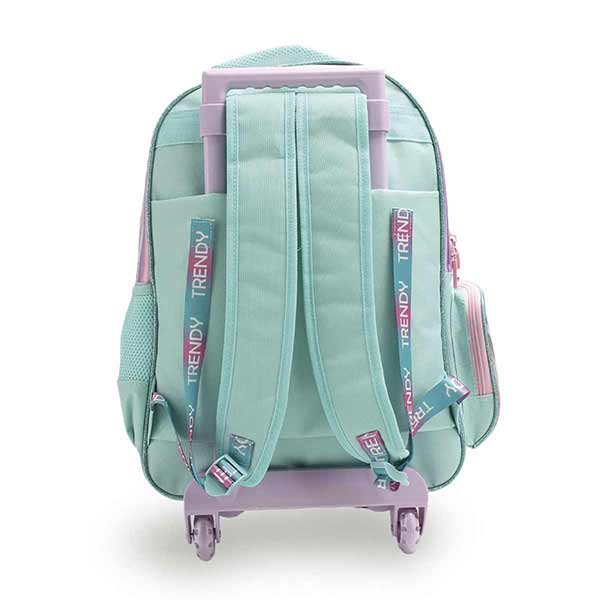 Mochila Carrito Trendy 27680. Color: Rosa con aqua. Material: 50% poliéster y 50% PVC. Medidas: 46 cm de alto x 34 cm de ancho x 20 cm de porfundidad. Alto con manija extendida: 77 cm aproximadamente.