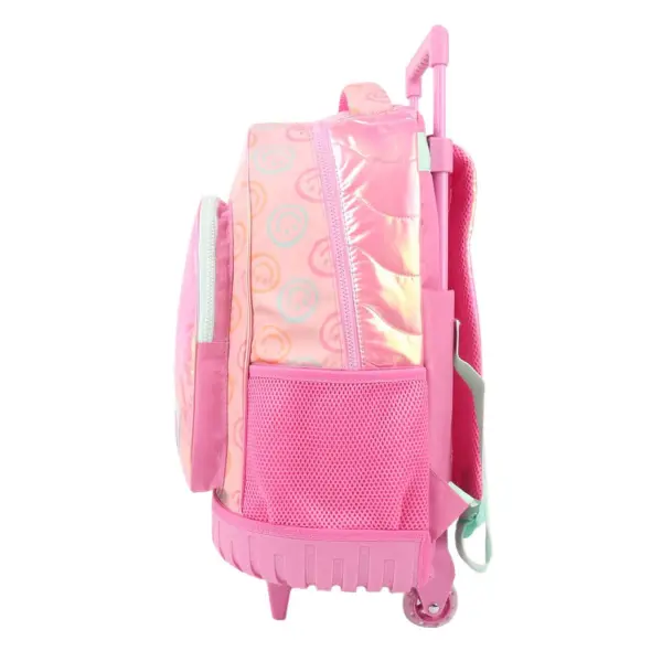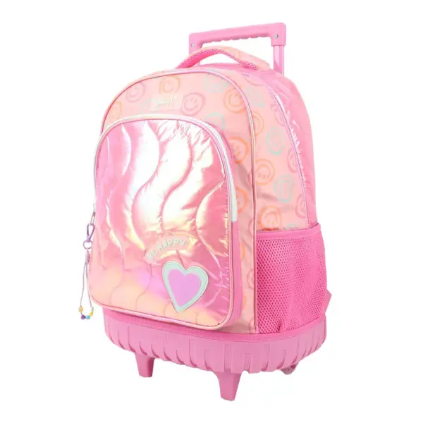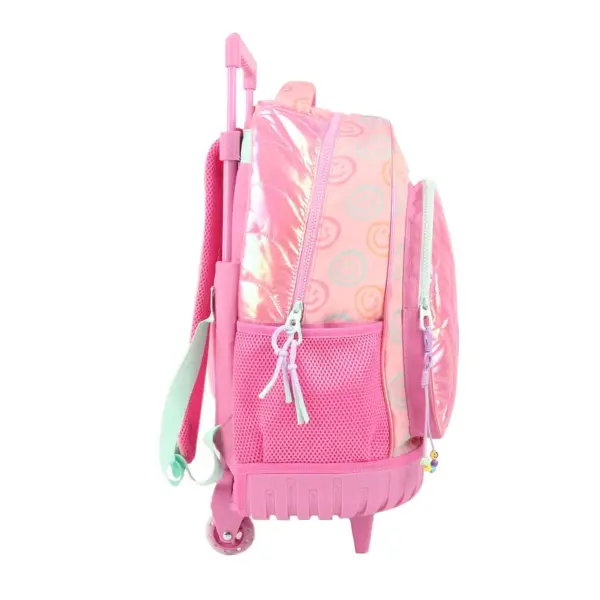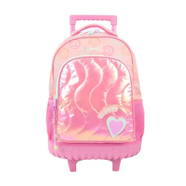 -Contiene: Bolsillo principal, bolsillo frontal, bolsillos laterales portabotellas, asa de transporte superior, tiras regulables con tela mesh, carro y ruedas reforzadas.