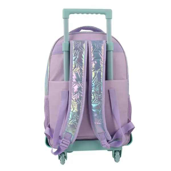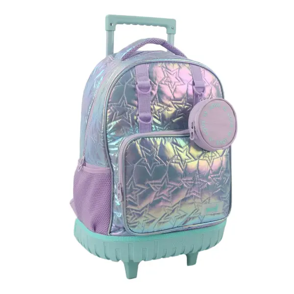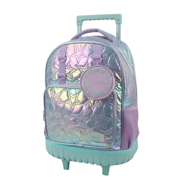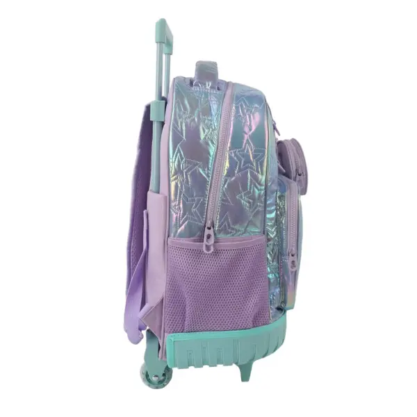 -Contiene: Bolsillo principal, bolsillo frontal, bolsillos laterales portabotellas, asa de transporte superior, tiras regulables con tela mesh, carro y ruedas reforzadas.