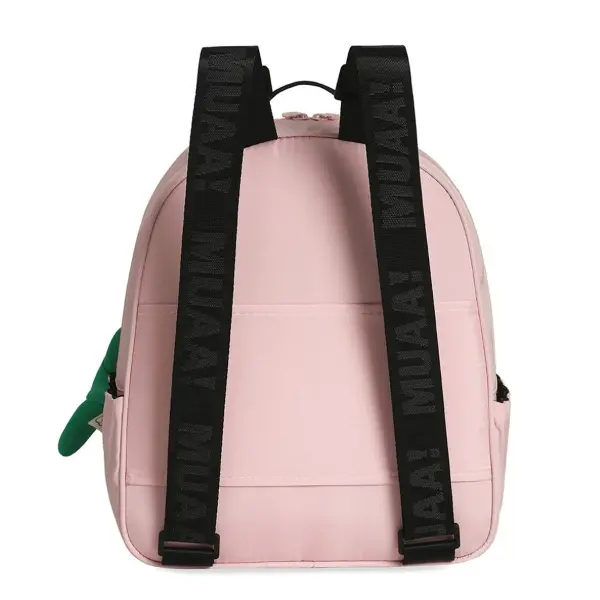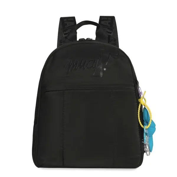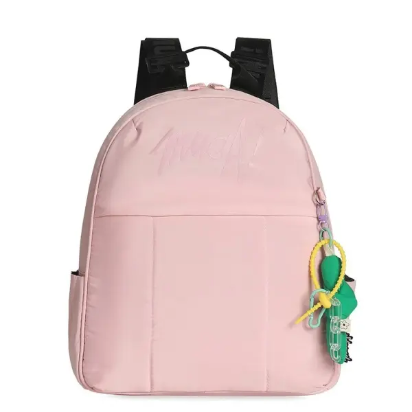 ‘-Color: Beige, Negro y Rosa. -Material: 100% Nylon. -Medidas: Alto 32 cm x Ancho 28 cm x Profundidad 12 cm. -Contiene: Bolsillo principal con organizador interno, bolsillo frontal, bolsillos laterales, tiras regulables, asa de transporte superior, sujeción para valija. -Incluye llavero desmontable.