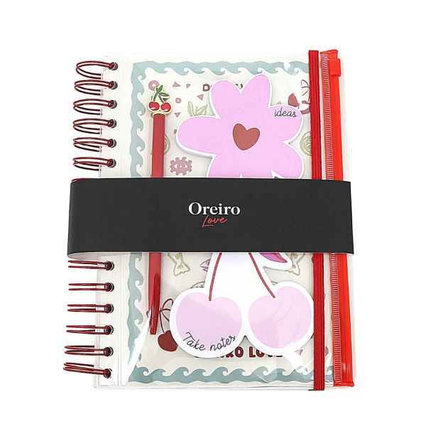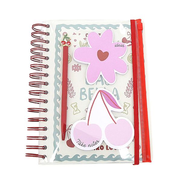 Set contiene: Cuaderno, Lapicera, Dos Block de notas (8×8 y 8×9 cm) y Sobre transparente.