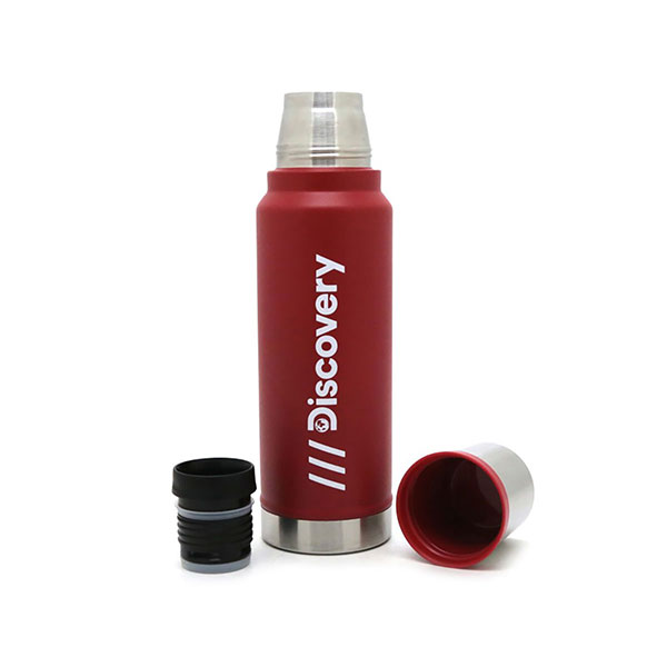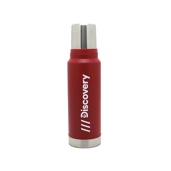 Termo Discovery 16320. Color: Rojo. Material: Termo doble capa 100% acero inoxidable, tapón vertedor y capa interna de la tapa 100% polipropileno y burletes 100% de silicona, tapa a rosca capa externa 100% acero inoxidable. Capacidad: 1000 ml. Medidas: 33,5 cm de alto x 9 cm de diámetro.